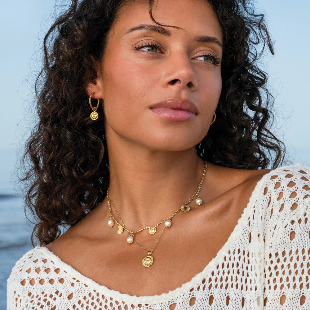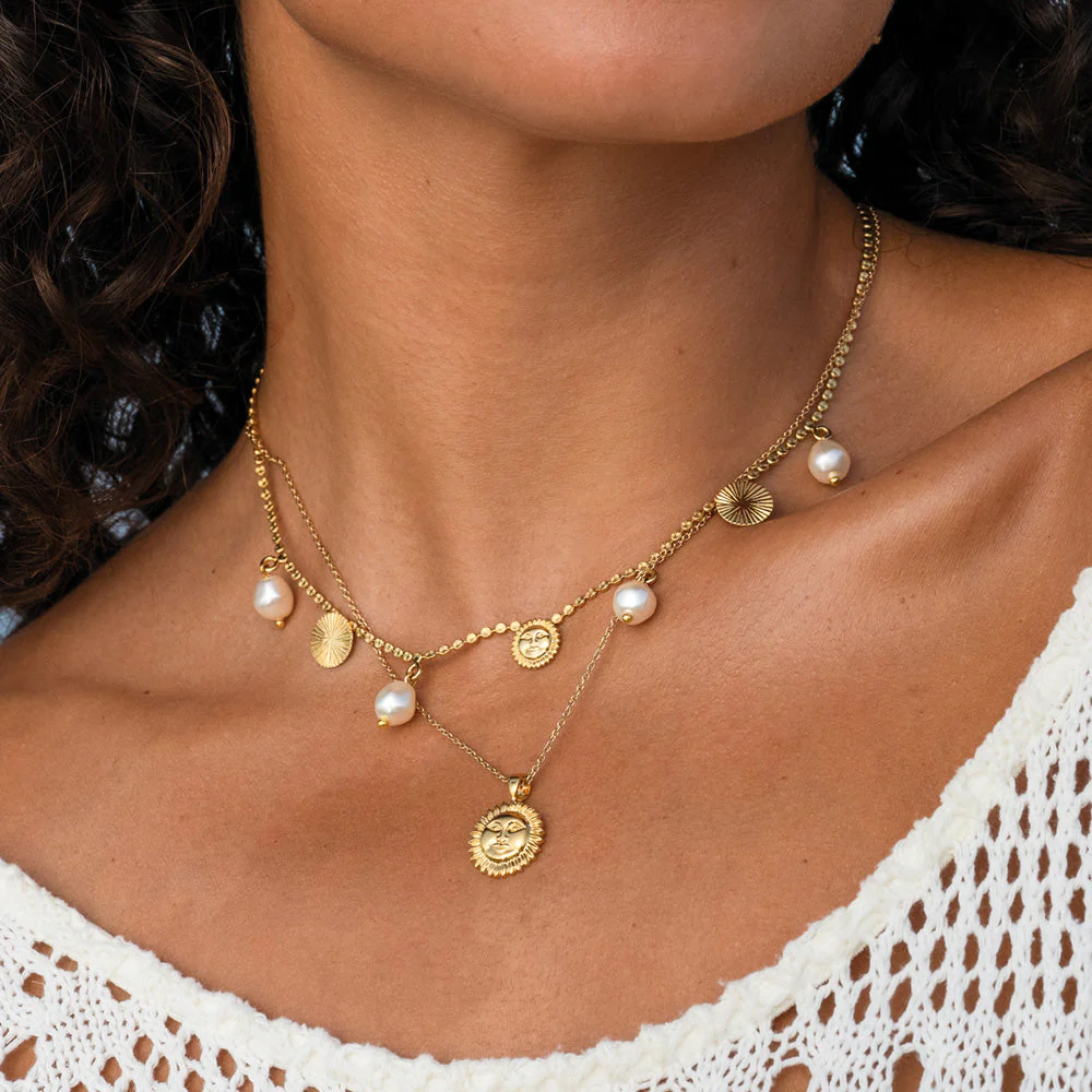 Halsband med solmotiv i 18K guldplätering och kristaller. Ett elegant och kraftfullt smycke från Apollo-serien – handgjort i Grekland.