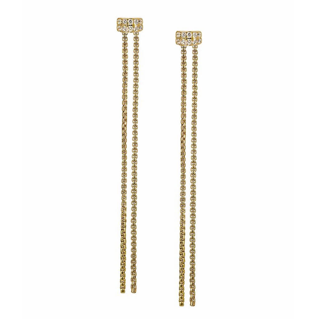 Clarissa Långa örhängen i Guldpläterat stål. 2 hängande kedjor från en båge på stift fylld med vackra infattade kristaller.