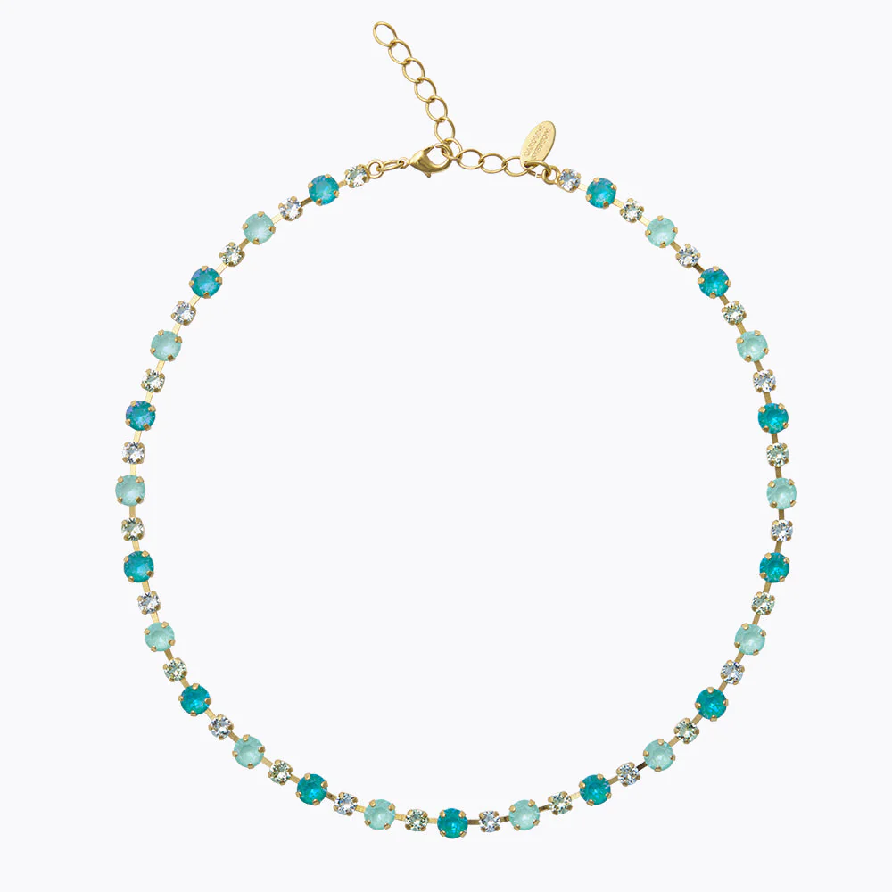 Guldpläterat halsband med lagunblå kristaller. Handgjort i Grekland med graverad logotyp och justerbar längd – från Calanthe-serien.