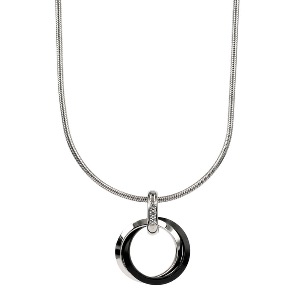Kort halsband med hänge av 2 sammanlänkade ringar med små stenar. Storlek på hänge: 2 cm diameter på ringarna. Längd: 40 cm + 6 cm förlängningskedja. Färg: Blankt Stål / Matt Svart. Material: Stål