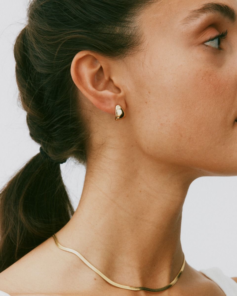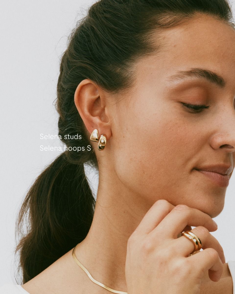 De här studsörhängena har en avskalad form och omsluter örsnibben fint. Selena Studs ses här i 14K guldplätering.