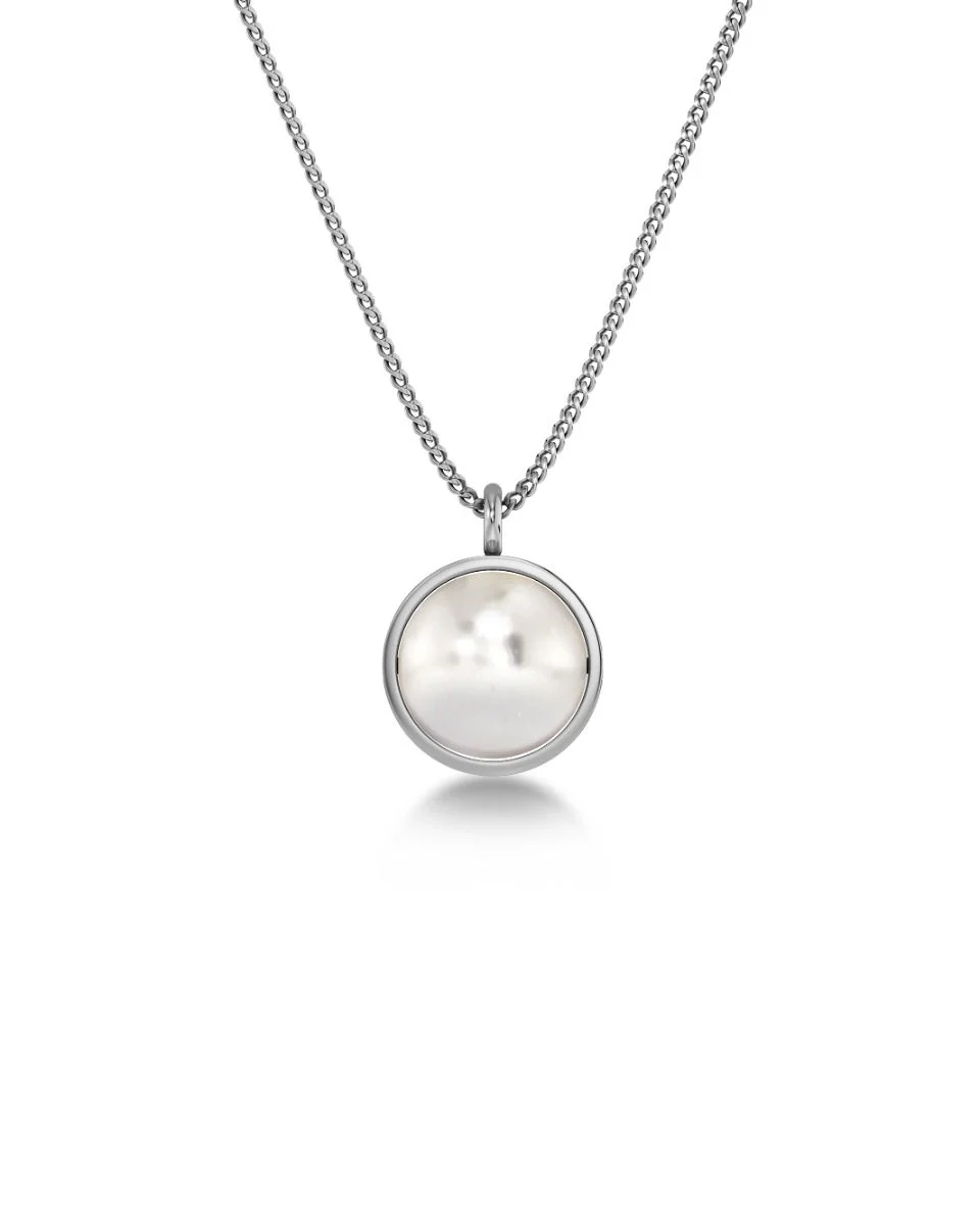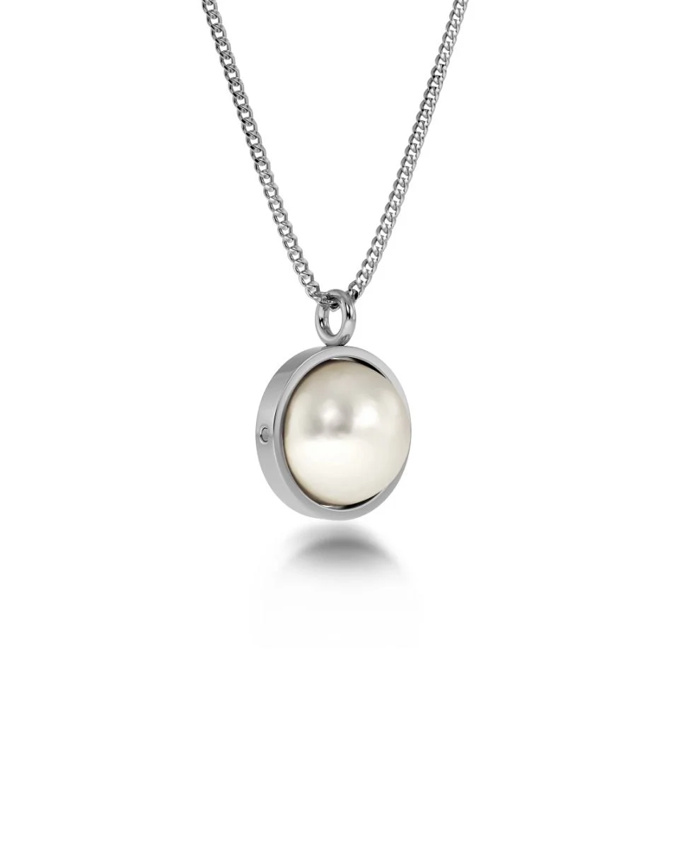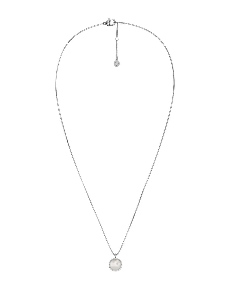 Elegant halsband i blankt rostfritt stål med pärlemorpärla (8 mm) i stilren design. Justerbar längd 45–48 cm. Nickelsäkert och vattentåligt.