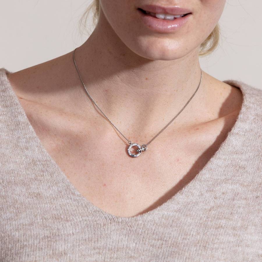 Diameter stor ring 14 mm, liten ring 10 mm, halsbandets justerbara längd 40-43,5 cm. Kubisk zirkon, blankt rostfritt stål. Nickelsäkert.