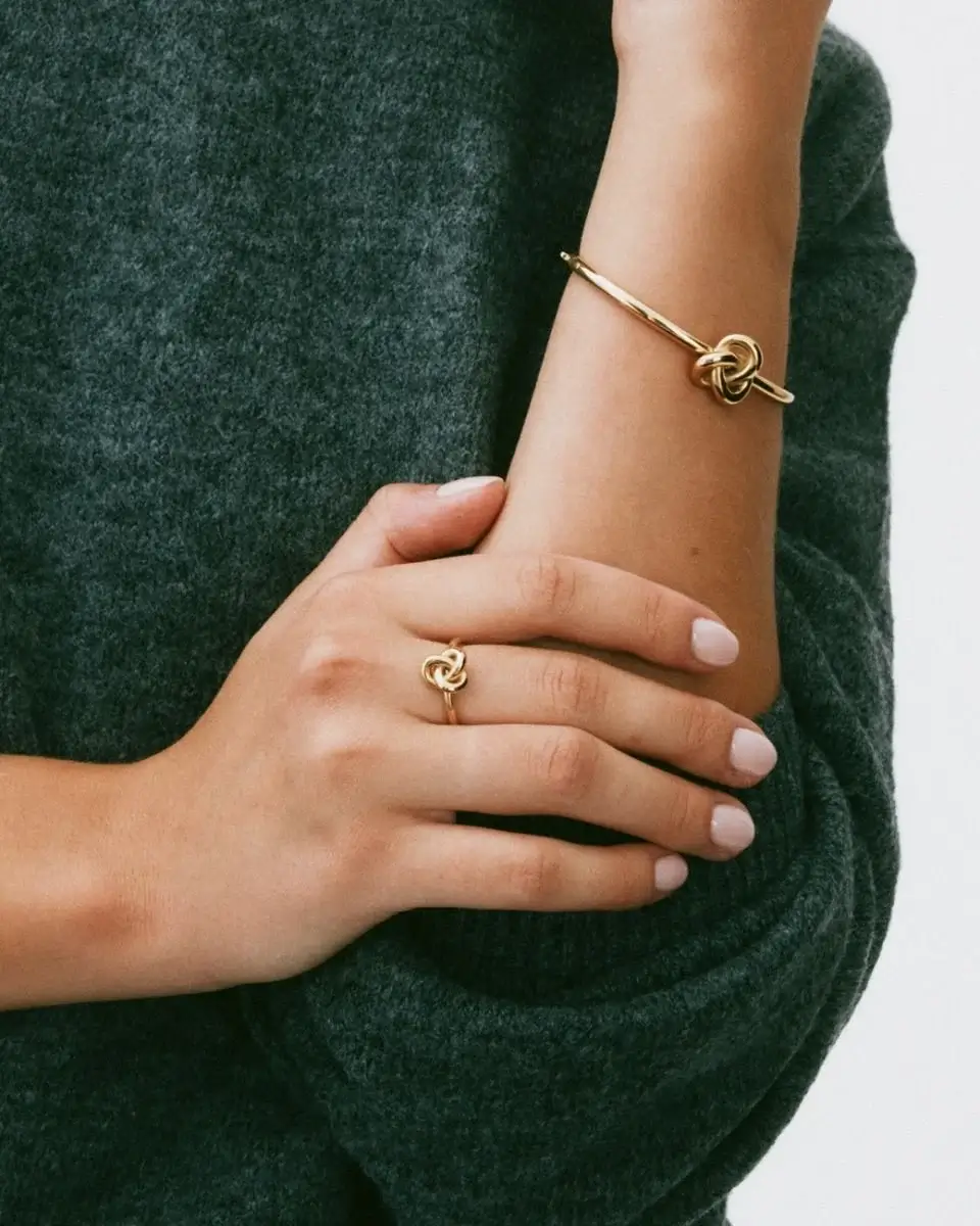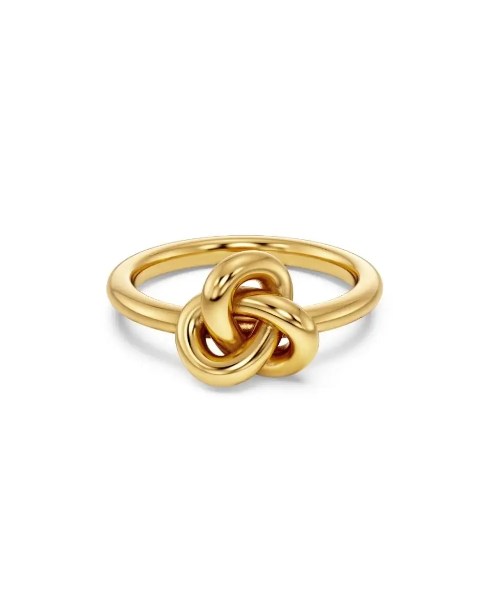 Det gyllene knutmotivets form skapar ett mjukt och lyxigt intryck. Eftersom ytan är blank och guldtonad upplevs ringen som exklusiv men samtidigt enkel. Dess design gör att den fungerar lika bra ensam som kombinerad med andra ringar.