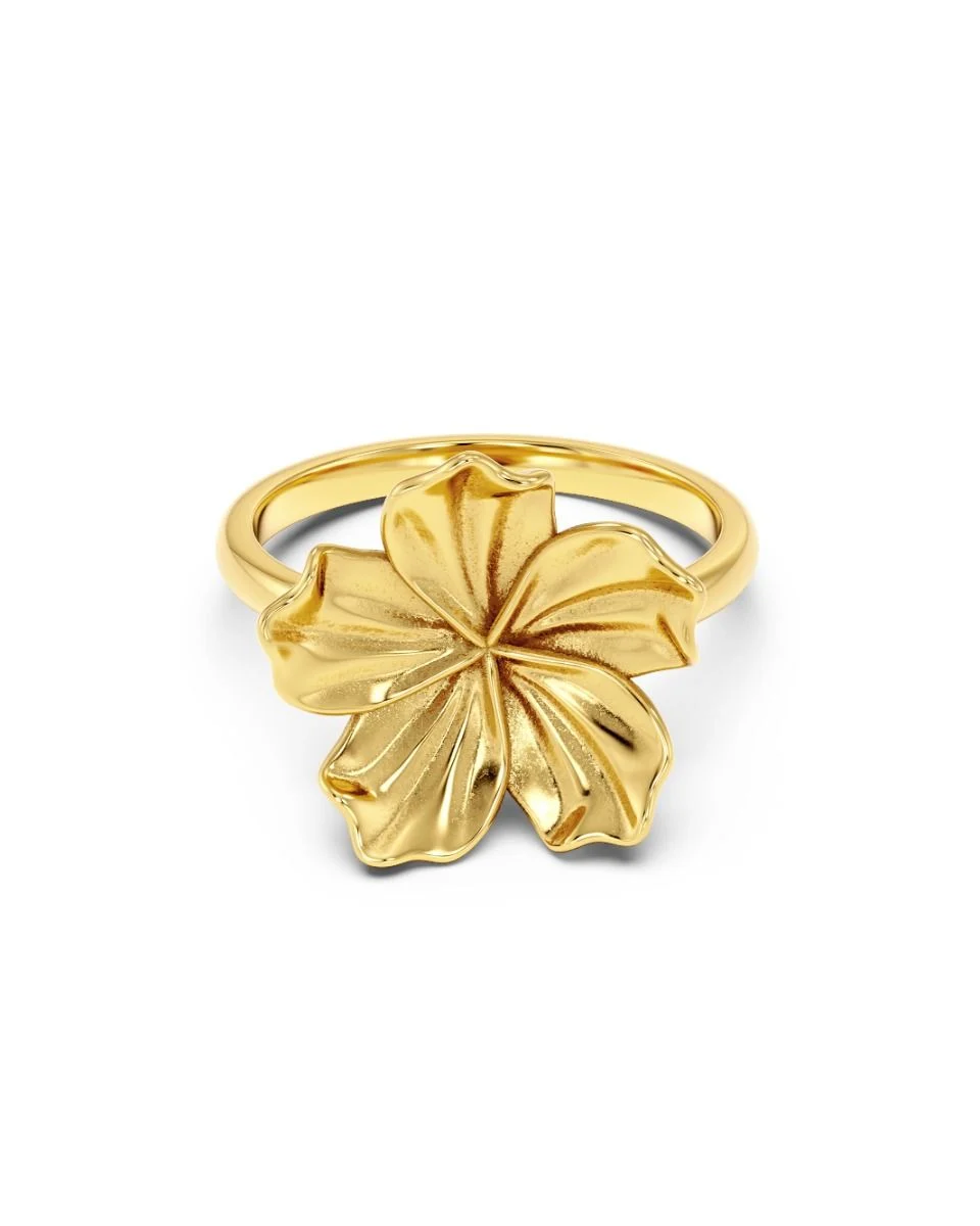 Ringen är vattentålig, vilket gör den idealisk för dagligt bruk. Den är tillverkad i rostfritt stål med en vacker blank 14K guldplätering som ger ett varmt, lyxigt skimmer. Dess nickelsäkra egenskaper gör den också skonsam mot känslig hud. Med sin smala skena och delikata blomma passar den fint ensam, eller tillsammans med andra ringar i lager-på-lager-stil.