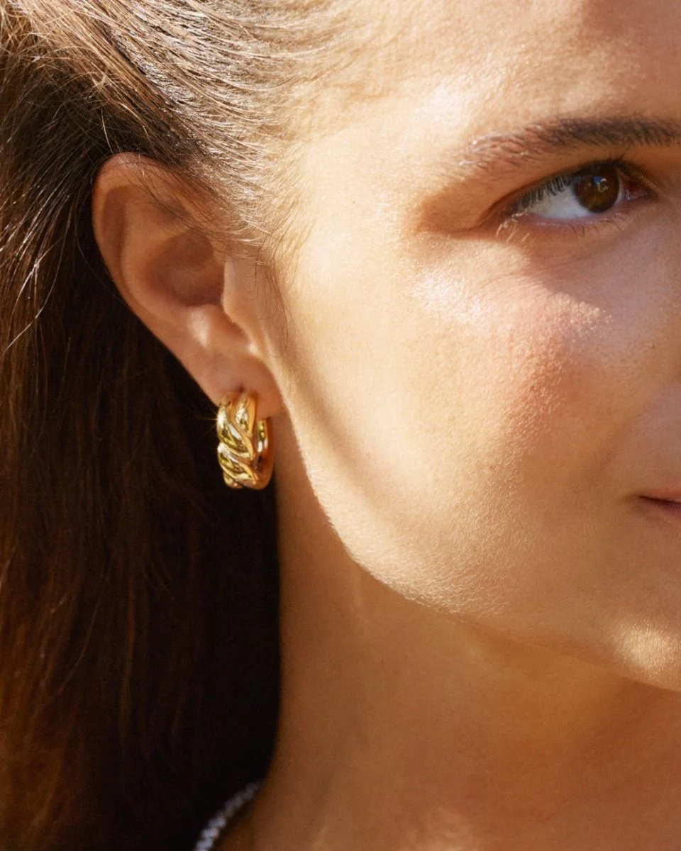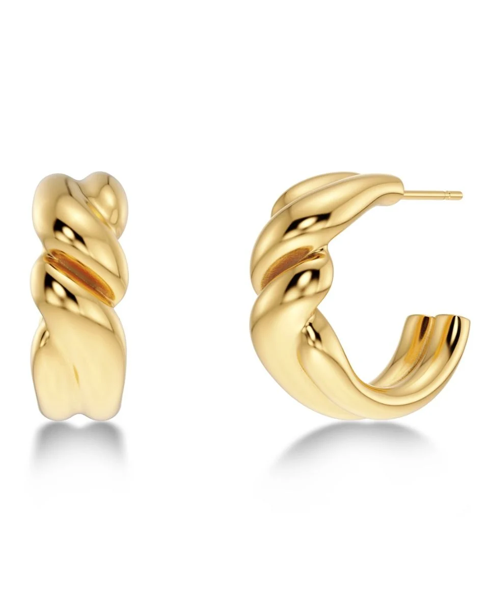 Twist bygger, som namnet antyder, på två sammanlänkade former som vrider sig runt varandra i en skulptural twist. En läckert rundad form som är lika tidlöst elegant vad du än stylar den med. De klassiska hoopsen, med seriens karaktäristiska knut, kommer i två av våra bästsäljande storlekar. Här i den lite större, i 14K guldplätering.