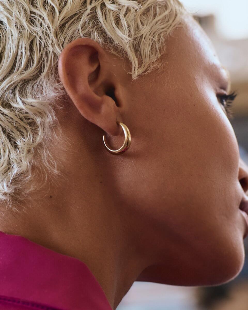 Furo hoops är, med sin eleganta form och enkelhet, perfekta örhängen att bära vid alla tillfällen. Furo creoler L är ett måste i smyckesgarderoben och ses här i blank 14K guldplätering. Namnet Furo betyder kärnan av flödet på japanska.