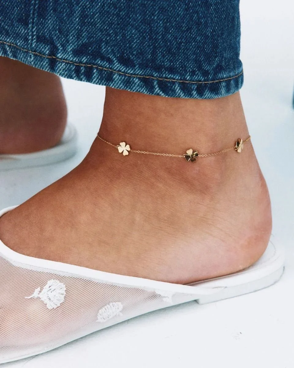 Rostfritt stål gör fotlänken extra tålig mot dagligt slitage och repor. Den blanka finishen ger dessutom en kall silverton som behåller sin lyster över tid. Varje fyrklöver mäter 7 x 8 mm och kedjan har en justerbar längd i fyra steg: 24, 25, 26 och 27 cm. Fotlänken har samtidigt både vattentåliga och nickelsäkra egenskaper, vilket innebär att du tryggt kan bära den på stranden och i duschen.