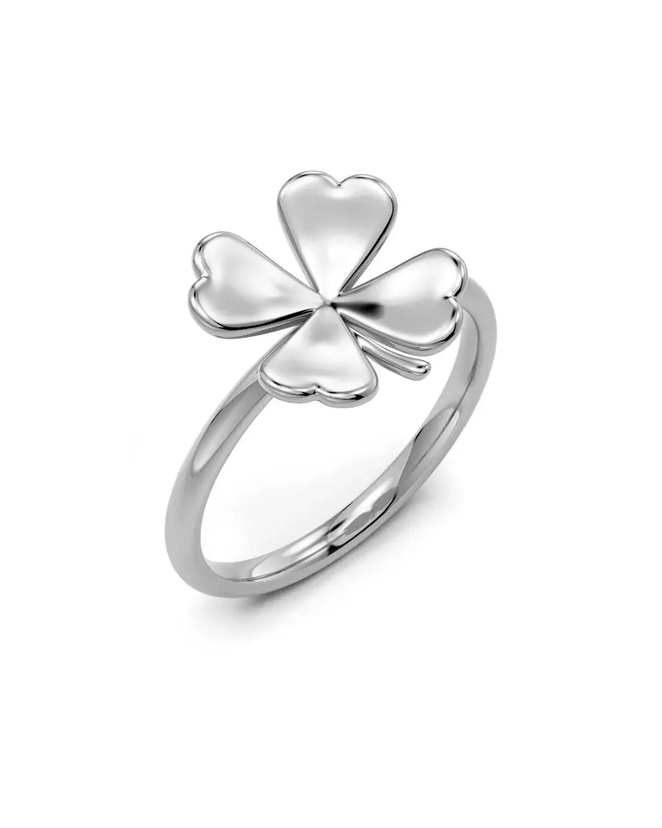 Den är tillverkad i blankt rostfritt stål, vilket ger ett modernt och minimalistiskt uttryck samtidigt som den är vattentålig och nickelsäker – perfekt för vardagsanvändning. Fyrklövern, som mäter 11×12 mm, blir ett elegant blickfång på handen utan att kännas överdriven.