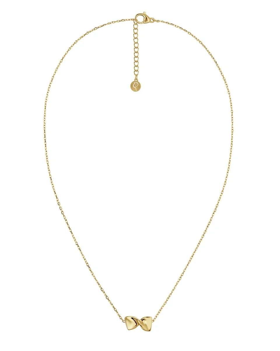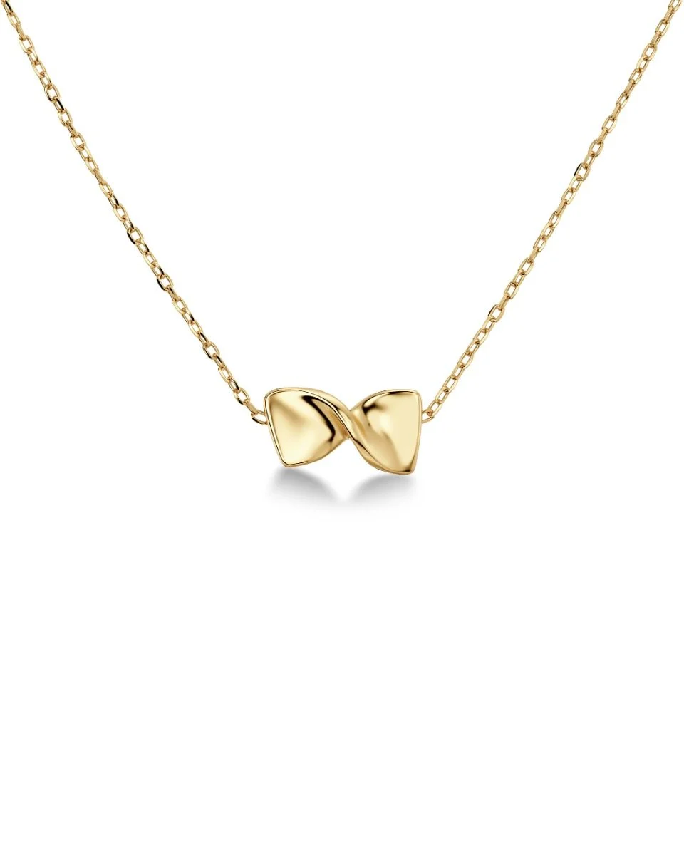 Halsbandet är tillverkat i rostfritt stål med 14K guldplätering och har en elegant, stiliserad form med en glänsande finish. Det är nickelsäkert och vattentåligt, vilket gör det både vackert och praktiskt för daglig användning.
