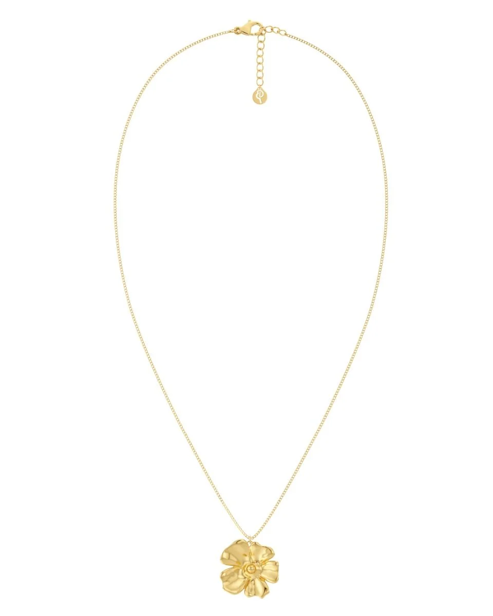 En utslagen blomma i sin fulla prakt bildar i sig ett naturligt vacker smycke som låtit inspirera till serien Floral. Blommor, små som stora, är smyckestrenden nu. Du bär Floral till alla tillfällen och ger gärna bort den som present. Floral halsband har här den större blomman som hålls av en pansarkedja, ses här i blank 14K guldplätering.
