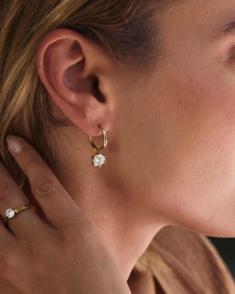 Vår populära serie Crown kommer här med fina små hoops. Under ringen hänger den stora klara stenen med eleganta infattningar och som du bara älskar att bära både till vardag och fest. Gnistrande stenar är alltid rätt och här ses Crown hoops L i blank 14K guldplätering. Bär gärna fler delar ur serien Crown.