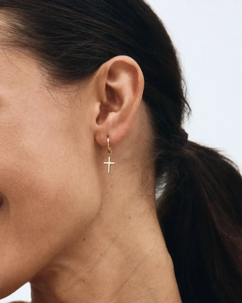Hoops i blank 14K guldplätering med avtagbara korscharms. Två stilar i ett och perfekta för ear curation. Nickelsäkra och vattentåliga.