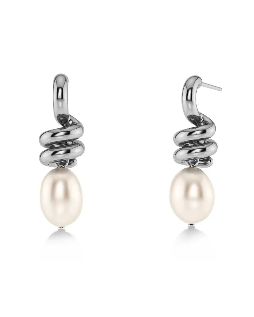 Eleganta rostfria örhängen med spiralform och pärldetalj från Edblad.