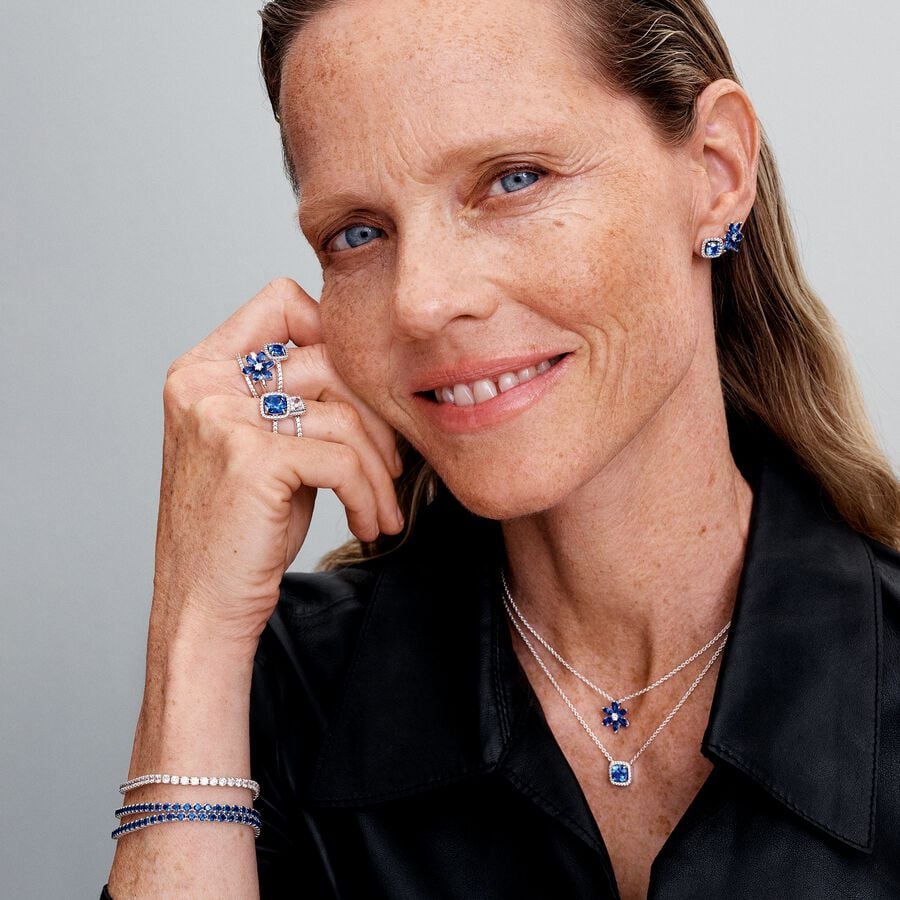 Tillför en touch av djupblått till din look med det här statementhalsbandet i sterlingsilver. Det här smycket är utsmyckat med en blå kristall som omges av en fyrkantig halo av pavéinfattade kubisk zirkonia och kombinerar modern och klassisk design. Hängsmycket är fäst på kabelkedjan som är justerbar i upp till tre olika längder och har en extra kloinfattad briljantslipad sten vid låset.