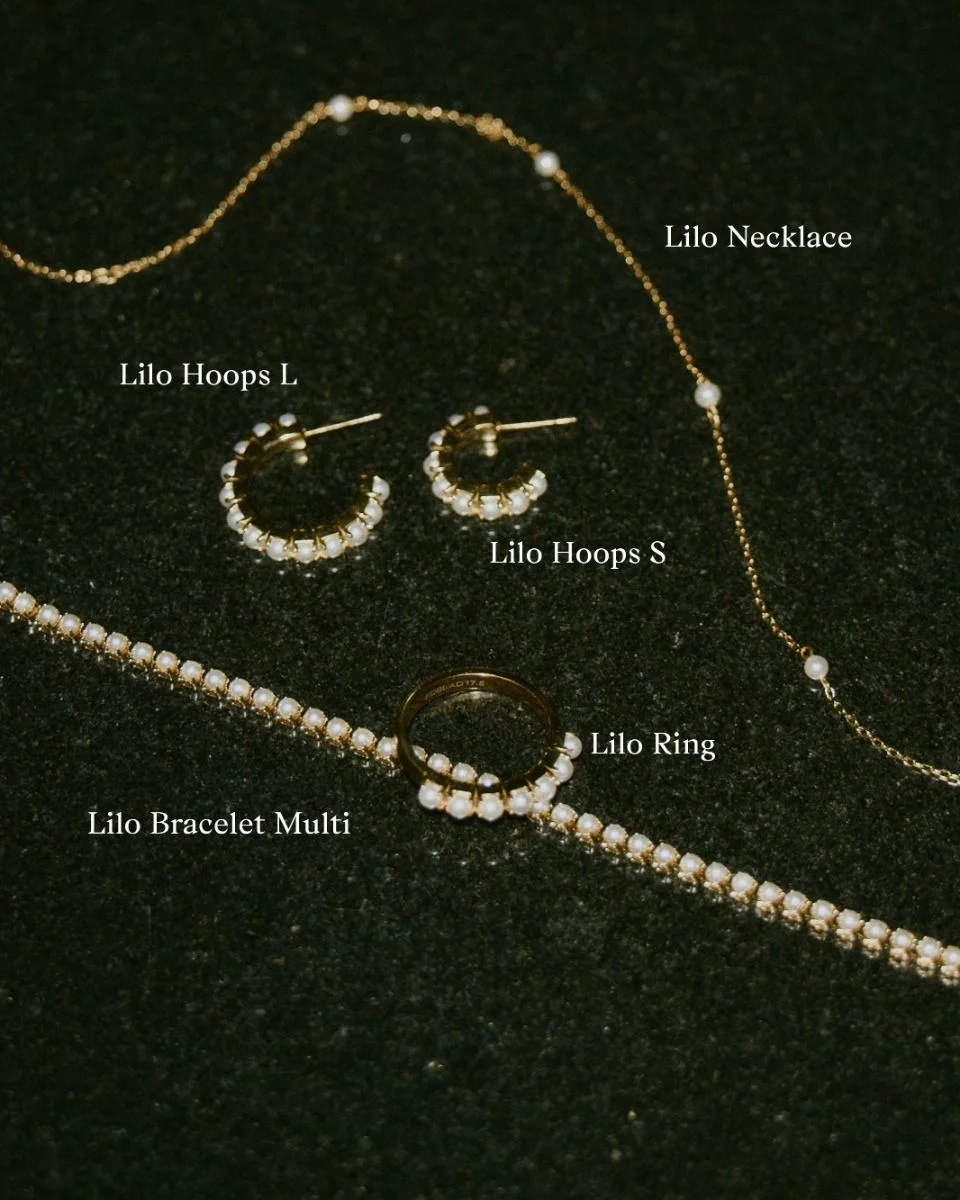 Materialet är rostfritt stål med polerad guldplätering. Lilo Hoops är nickelsäkra och vattenresistenta, designade för att hålla och följa dig i alla väder och tillfällen.