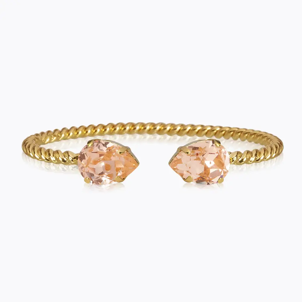 Vårt klassiska Mini Drop Bracelet är en stilfull detalj på din handled och gnistrar tack vare sina två droppformade kristaller av högsta kvalitet. Armbandet har en känsla av rep tack vare den vackert vridna metallen. Storleken kan justeras för att passa just din handled. Detta eleganta och gnistrande smycke passar alla tillfällen.