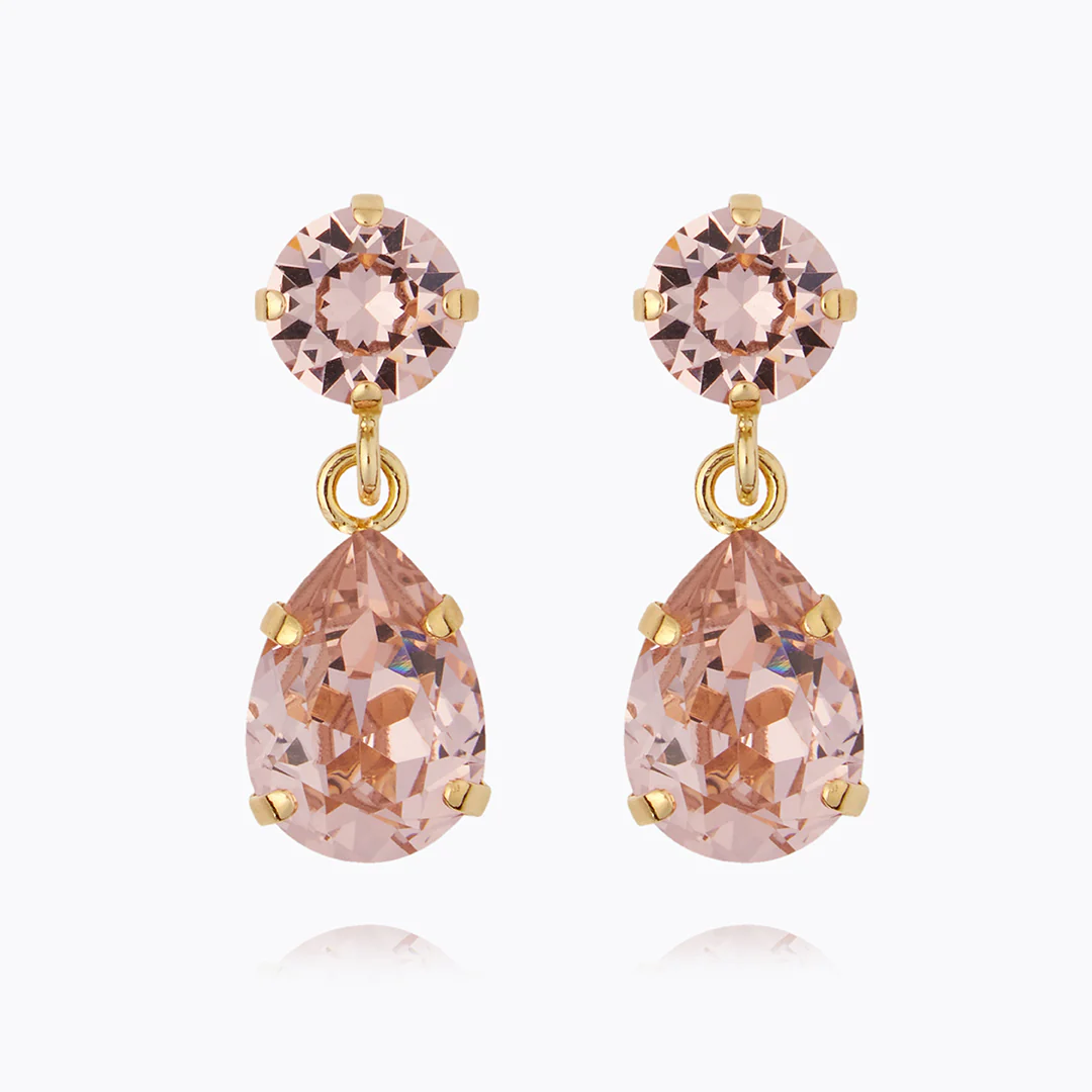Mini Drop Earring Gold Crystal från Caroline Svedbom. Ett par vackra örhängen I vintage-design. Dessa 18 karat guldpläterade örhängen är smyckade av en rund och en droppformad Swarovski-kristall.