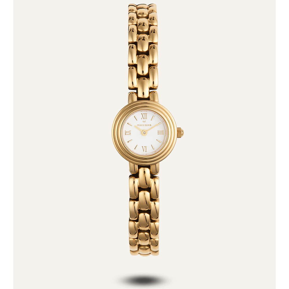 Vi presenterar vår nätta vintage klocka. Ett tidlöst smycke som inte bara är en vacker detalj på handleden. Med sitt rep och stöttåliga mineral glas och guld pläterat länkarmband är den lika hållbar som snygg. En tidlös klocka för alla tillfällen.