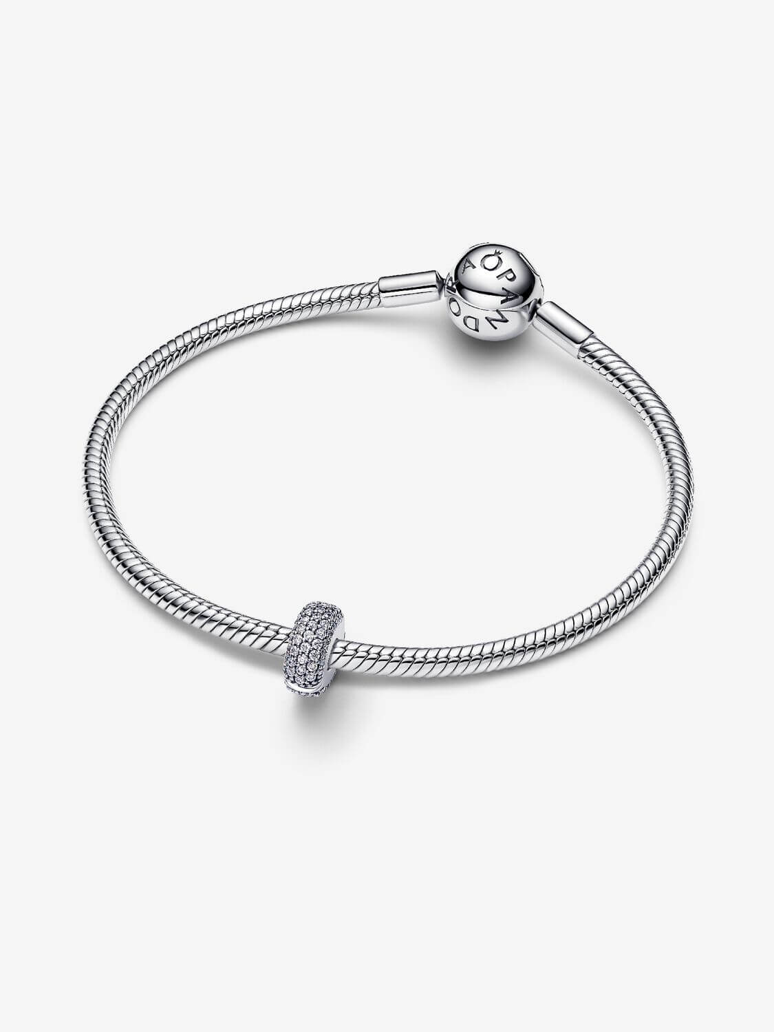 Pandora Clipberlock med pavéinfattade stenar – dekorativ charm i sterlingsilver med säker silikoninfästning. Elegant till din smyckeskollektion.