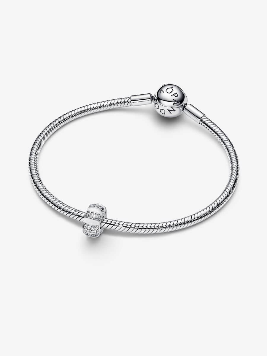 Pandora clipberlock i silver med vit emalj och glittrande stenar. Med silikonfäste som håller berlocken säkert på plats.