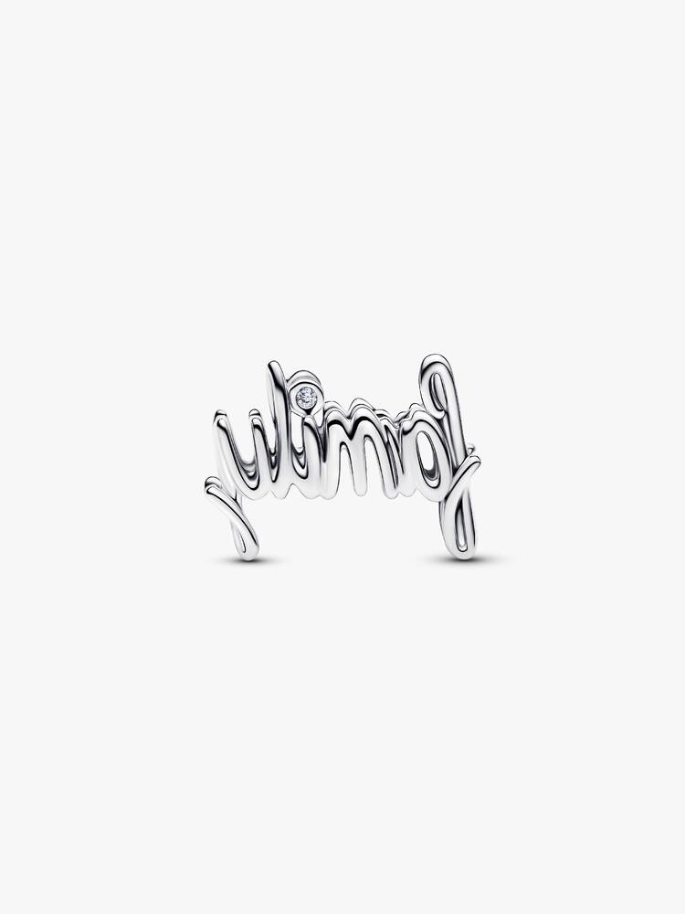 Handskriven familjeberlock i sterlingsilver – Pandora Moments-design med gravyr “family” och glittrande zirkonia.