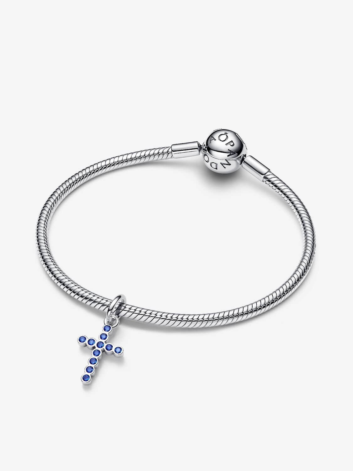 Pandora Hängberlock Kors är en elegant och meningsfull charm som förenar stil och symbolik. Tillverkad i polerat sterlingsilver och prydd med glänsande blå konstgjorda kristaller, fångar den både ljus och känsloladdad symbolik. Korset är traditionellt en symbol för hopp, kärlek och balans, och denna version utstrålar både subtil elegans och djup mening.