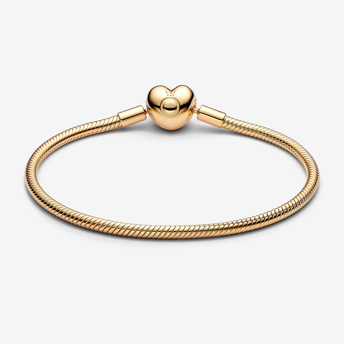 Låt handleden stråla med det här glänsande armbandet. Vårt ikoniska ormkedjearmband har fått en skimrande uppdatering i 14 karat guldplätering och ett polerat, hjärtformat lås. Låset har en graverad Pandora-logotyp på ena sidan och Pandora Crown O-logotypen på den andra. Styla detta ormkedjearmband från Pandora med 16 till 18 berlocker för en snygg vardagslook.