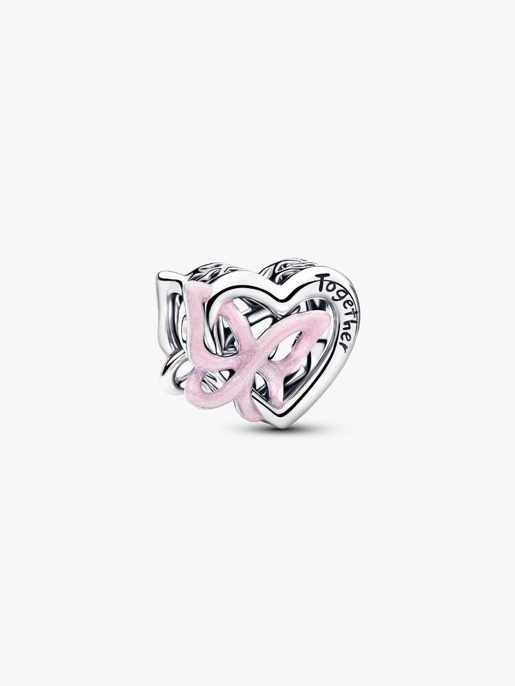 Pandora Sammanflätat Hjärta och Fjäril, Berlock – i sterlingsilver med rosa emaljfjäril och graverat ”Together” och ”we have it all”.