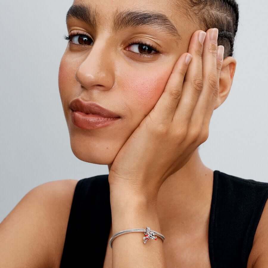 Älskar du Musse Pigg? Det finns en berlock för det. Den här romantiska och lekfulla designen är tillverkad i sterlingsilver och pryds av klarröd emalj på Musse Piggs signaturshorts och den hjärtformade spetsen på hans pil. Öglan är formad som hans vingar för en lekfull touch och berlocken är graverad med ©Disney-logotypen. Den här berlocken är ett unikt tillfälle att samla Musse Pigg som Amor och hyllar kärlekens glädje och Disneys magi.