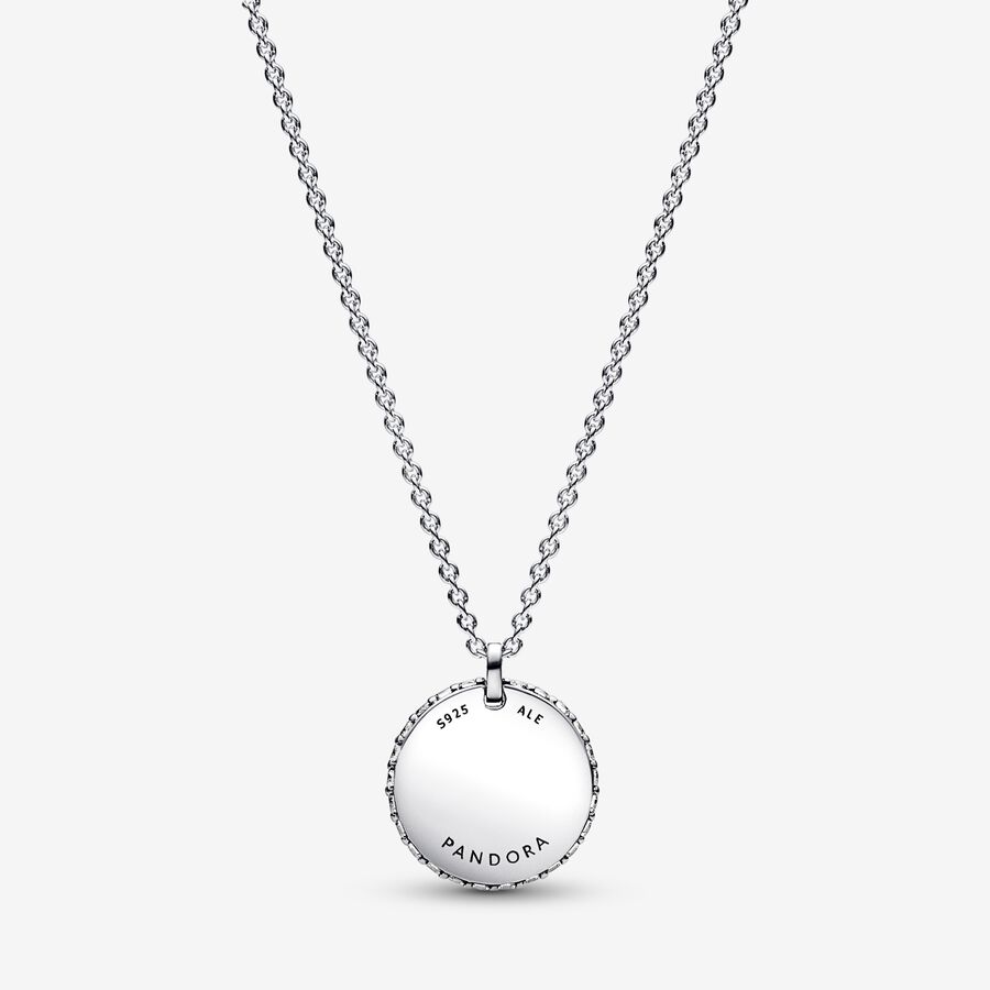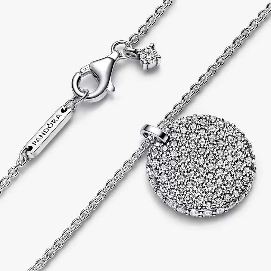 Låt glittret tala för sig själv med vårt Pandora Timeless pavéprydda halsband med hängsmycke. Halsbandet är designat i sterlingsilver och har en medaljonginspirerad platta som är utsmyckad med 89 klara kubisk zirkonia. Alla stenar är vända utåt och även kanten på medaljongen är ingraverad för en tredimensionell effekt. Baksidan pryds av Pandoras logotyp. Låt din kärlek till glitter stråla med detta unika smycke eller ge det till personen som lyser upp ditt liv.