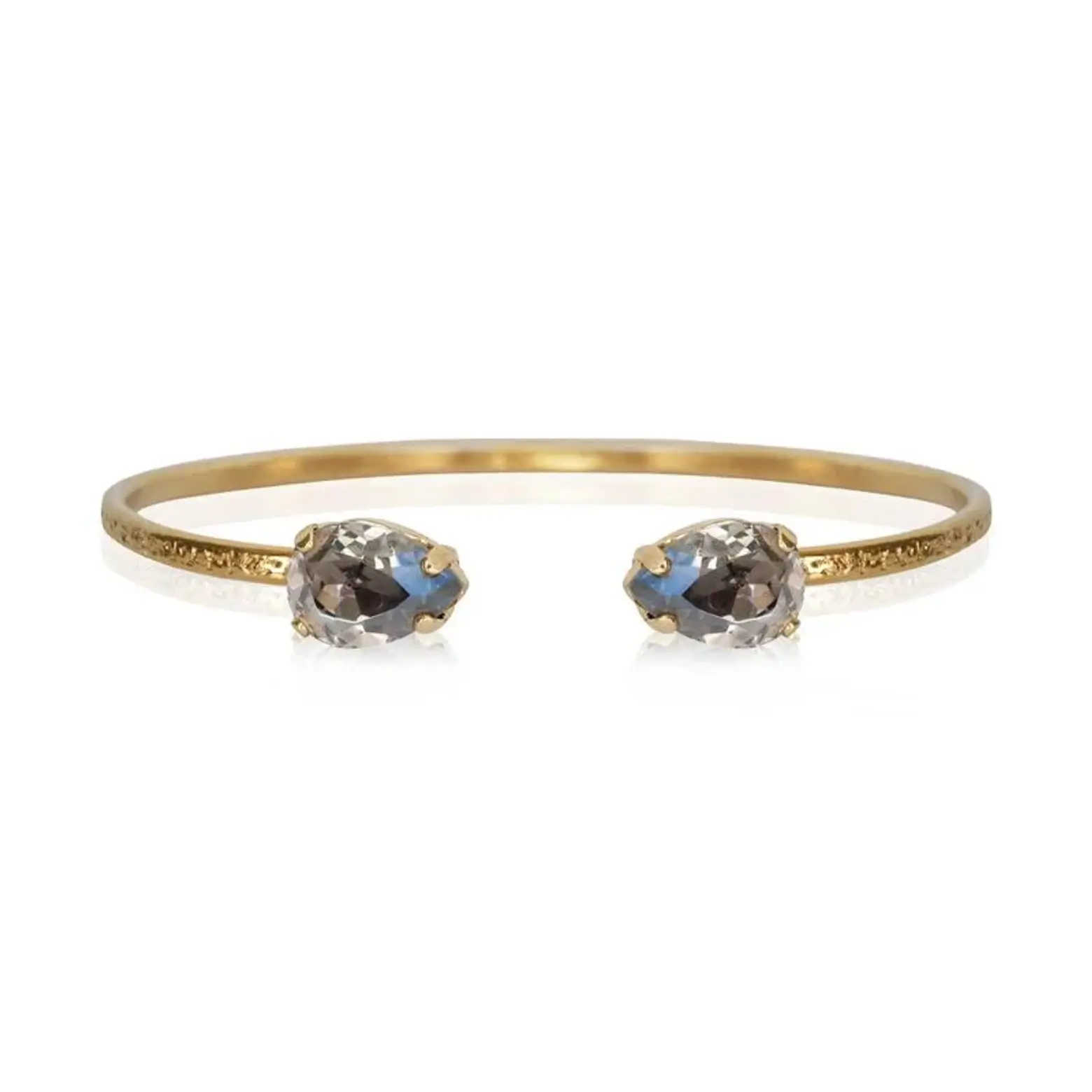 Petite Drop Bracelet Black Diamond är ett elegant och diskret armband från Caroline Svedbom, prytt med två droppformade kristaller i vacker blå “denim blue”-ton. Basen är tillverkad i mässing med valbar plätering i 18K guld eller rhodium, vilket ger en mångsidig finish som kompletterar många stilar.