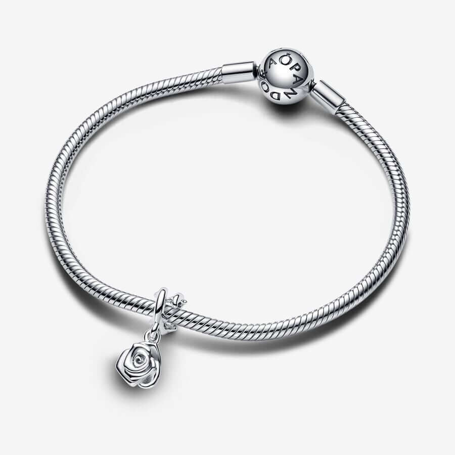 Lyft fram blommornas symbolik med hängberlocken Rose in Bloom från Pandora Moments-kollektionen. Den här berlocken är tillverkad i sterlingsilver och visar upp en utsökt, tredimensionell ros med blomblad i flera lager som för tankarna till kärlekens blomstrande essens. Den polerade konvexa baksidan tillför en sofistikerad touch medan hänget i sterlingsilver format som rosens stjälk med upphöjda taggar och tillför en realistisk känsla. Denna berlock är en symbol för tidlös kärlek och fångar den klassiska gesten att ge bort en ros – fast med en unik Pandora-twist.