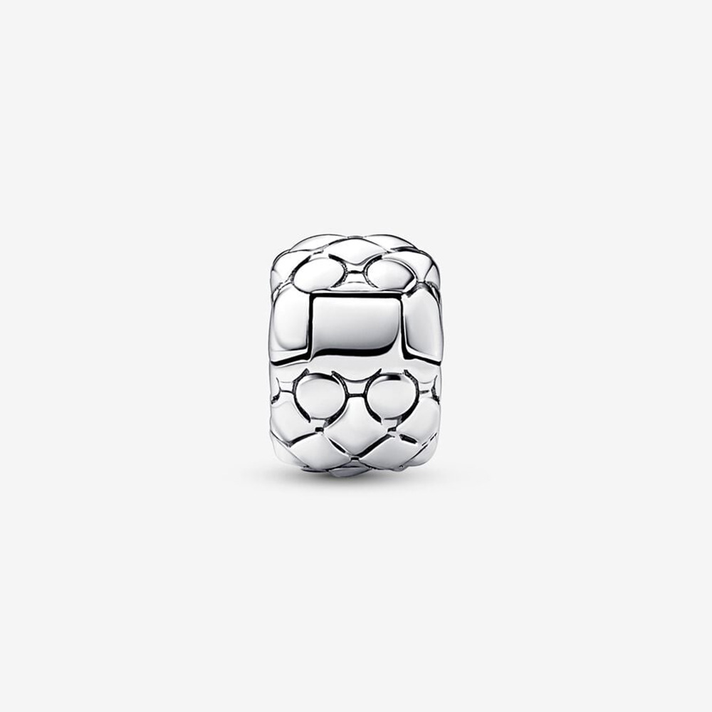 Låt ännu mer av den klassiska pärlade ytan bli en del av din look med den här clipberlocken i sterlingsilver från Pandora. Det har en sfärisk pyramidform som gör att den passar perfekt på ditt armband. Berlocken har inga silikonfästen på insidan utan ger din look rörelse samtidigt som den håller dina berlocker skilda åt. Den kommer att sitta kvar när den stylas på trådar, men skiljer berlockerna åt. Skapa en kamouflageliknande look genom att lägga till den i den stenprydda kedjan med samma nyans.