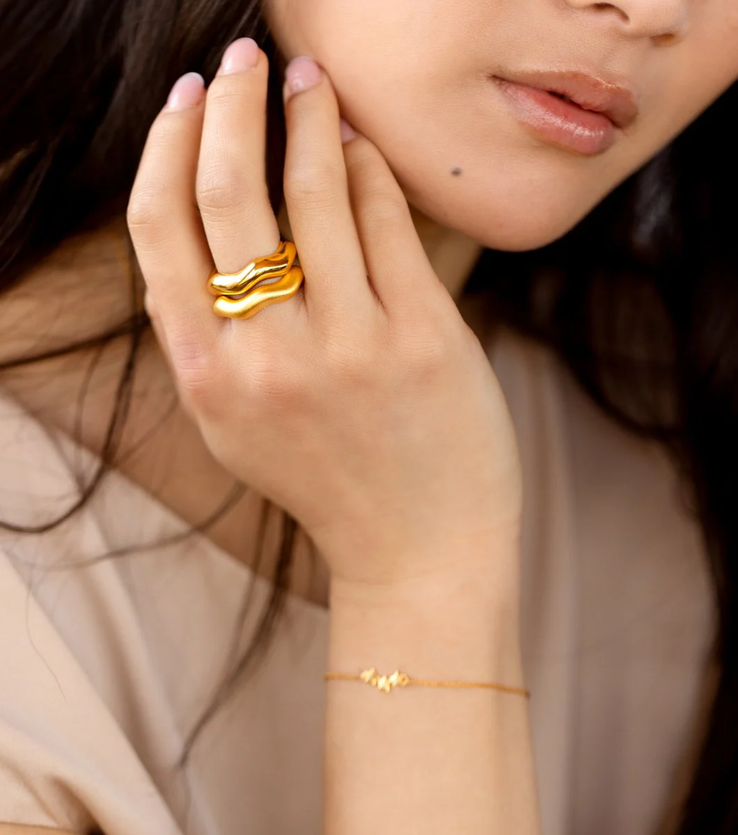 Bolded Wavy Ring är mjukt rundad för att sitta bra på fingret. Ringen är utfromad i ett vackert, vågigt mönster som skapar elegans och passar till alla tillfällen. Ringen har en blank yta och tillverkad i 100% återvunnet silver, pläterad med 18K guld. Varför inte bära ringen i guld och silver tillsammans?
