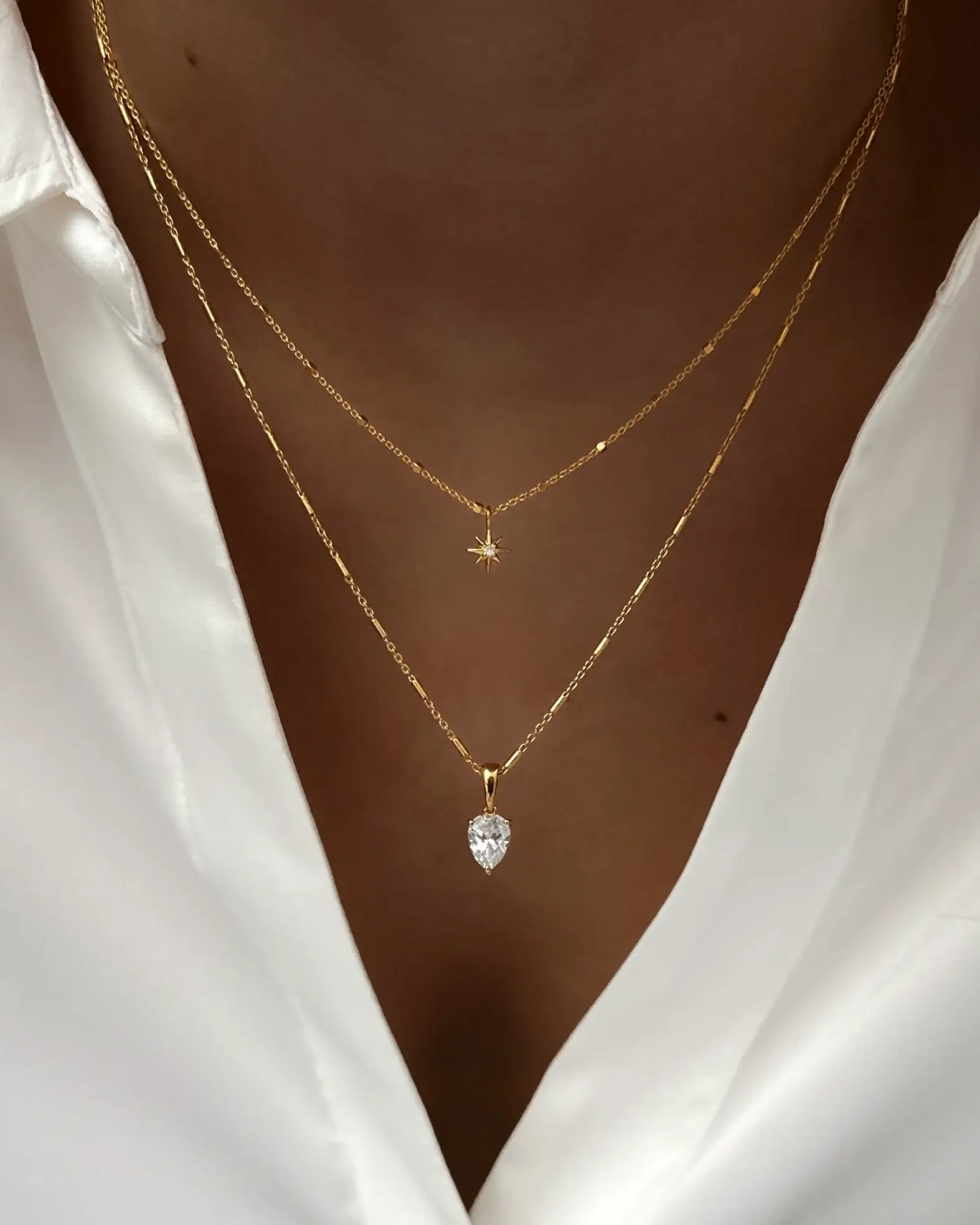 Det är tillverkat i 100% återvunnet sterlingsilver, pläterat med exklusivt 18K guld, vilket ger smycket en varm, lyxig glans. Halsbandets unika kedja har en justerbar längd (39,5–42 cm) och är smyckad med en stjärnformad berlock och en fasetterad kristall som fångar ljuset på ett elegant sätt.