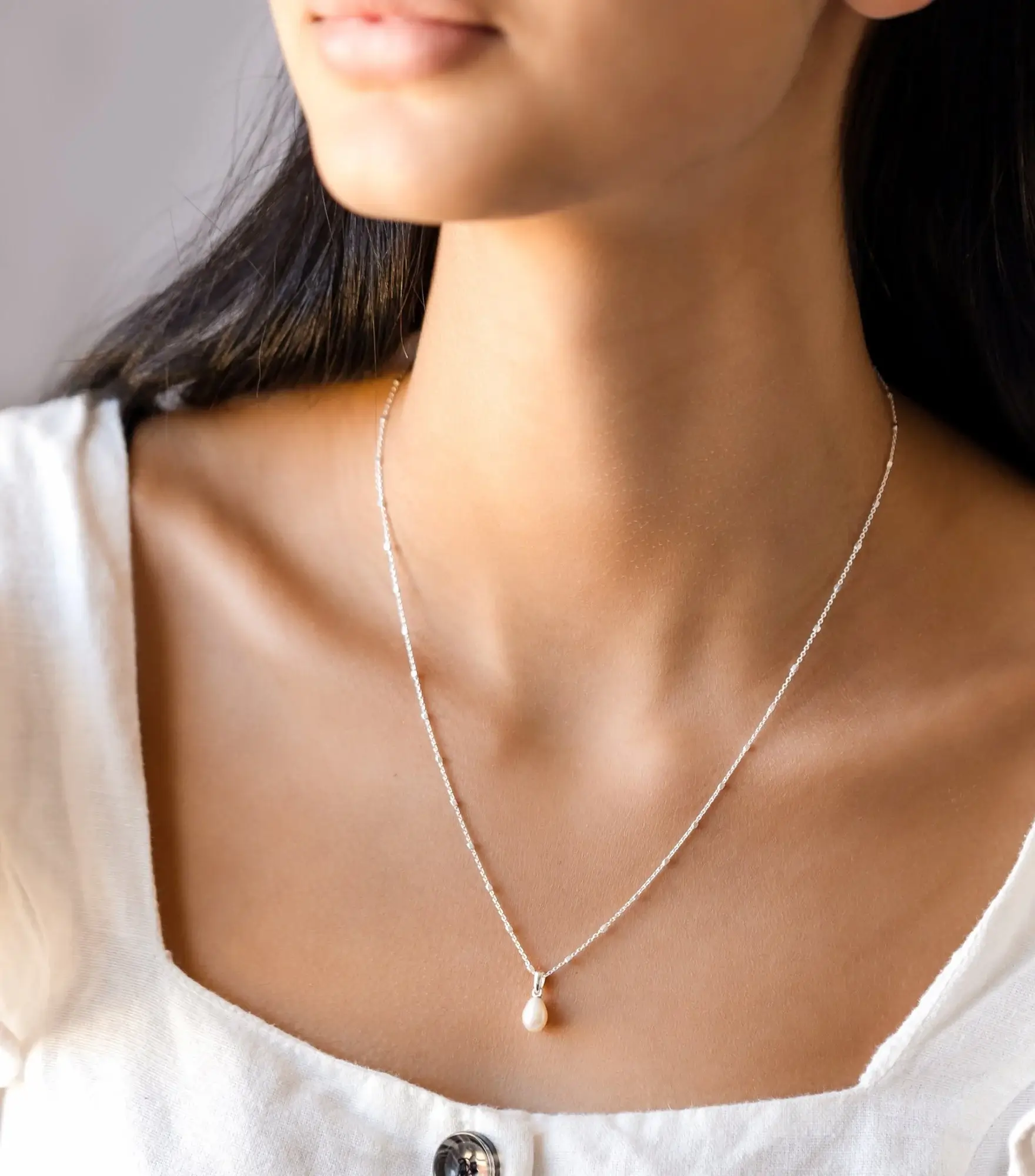 Bär med dig sommarkänslan vart du än går! Vackert halsband med en unik kedja utsmyckad med en droppformad sötvattenpärla. Tillverkad i 100% återvunnet sterlingsilver. Kombinera det gärna med andra smycken ur samma kollektion!