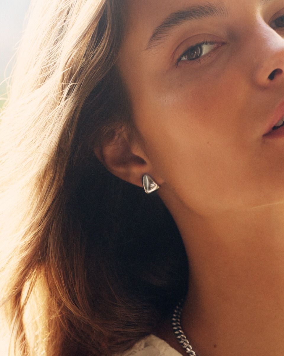 De här studsörhängena har en avskalad form och omsluter örsnibben fint. Selena Studs ses här i blankt rostfritt stål.