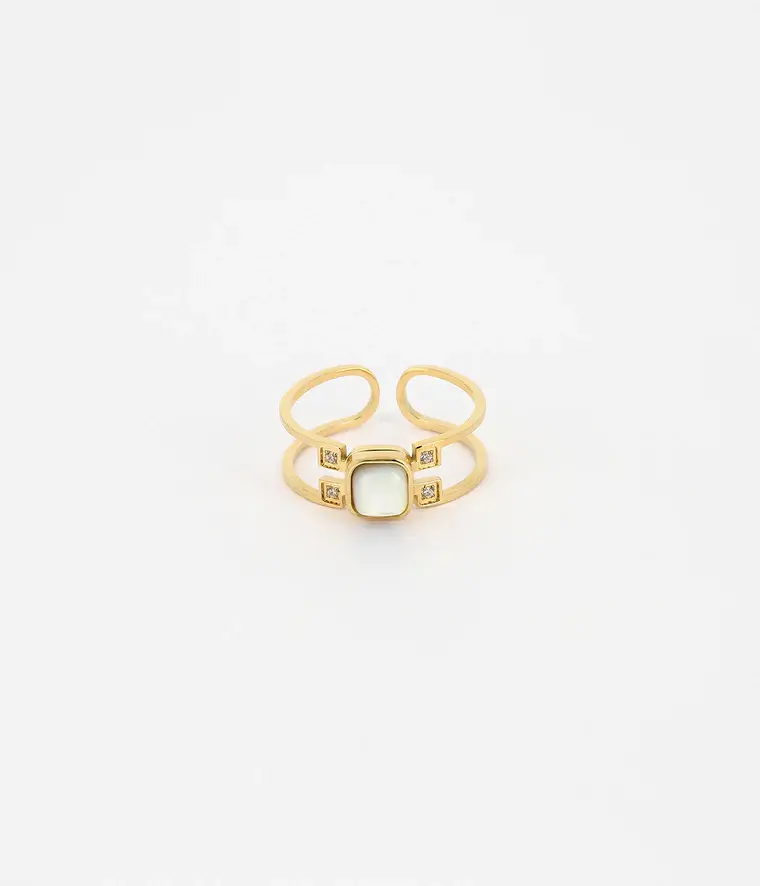 Adjustable ring in gold-plated steel. The finesse of this ring is remarkable. It is decorated with a natural stone surrounded by four small zirconiums.